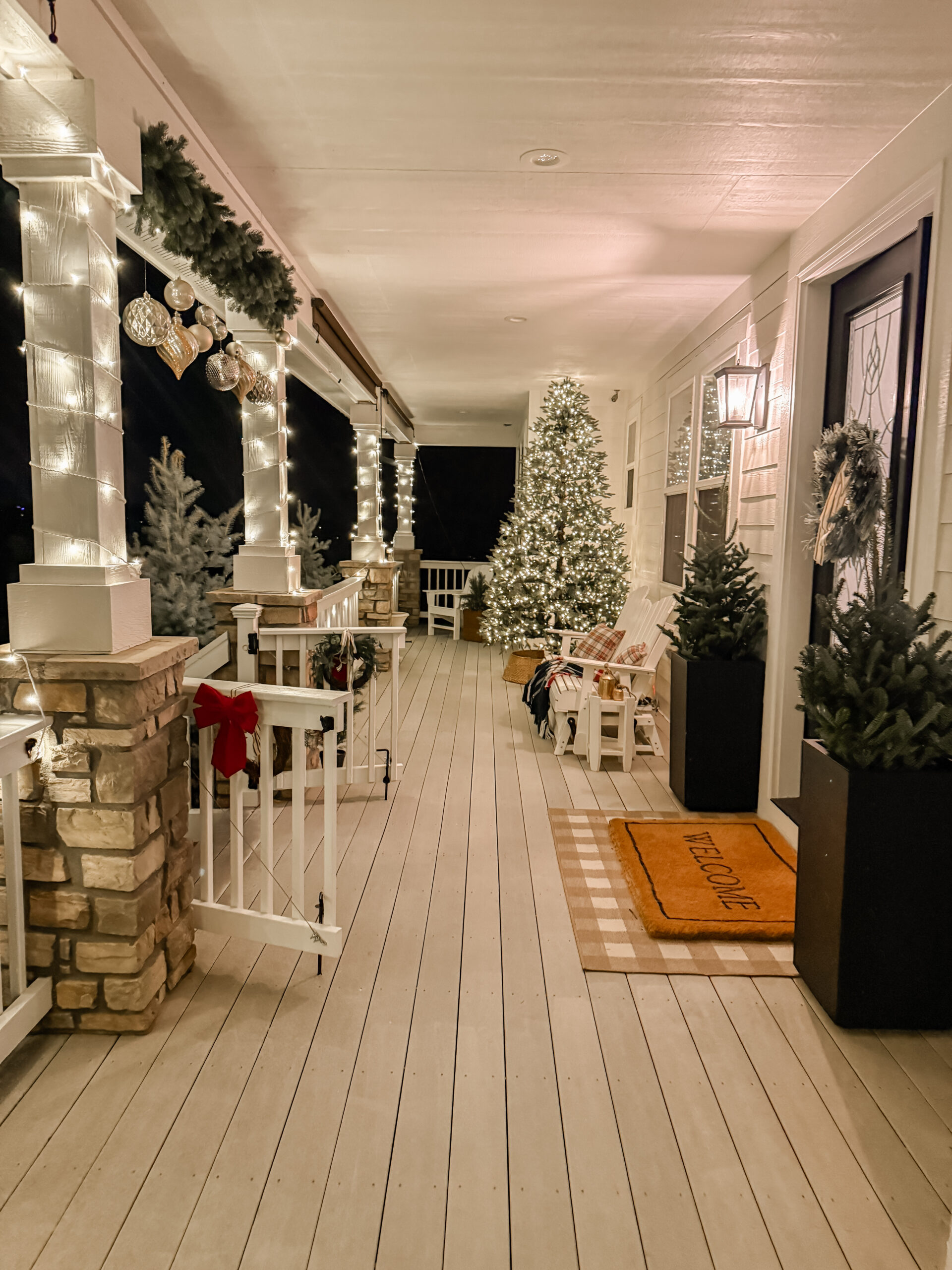 Funny story about that Christmas tree in the corner. I bought that last year when we had that huge living room at the old house. It’s 12 feet tall and HUGE around the bottom. I have no space for it inside, so I decided to try it here on the porch. I had to take one of the middle sections out of the tree, but it totally works!